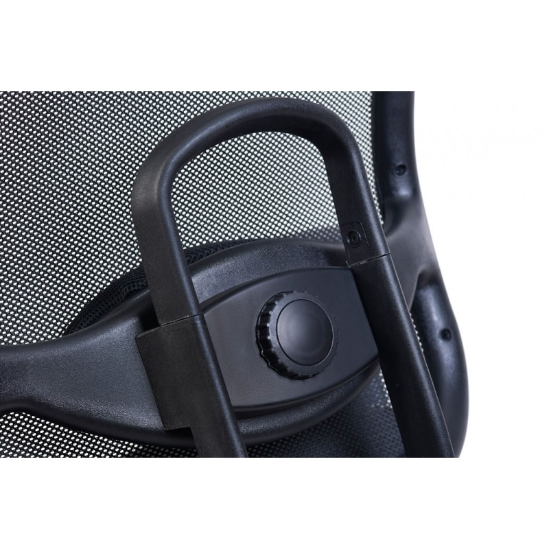 Scaun ergonomic rotativ cu tetieră 2D, mecanism sincron cu antișoc blocabil în 4 poziții, șezut poliuretan densitate mare, spătar tapițat cu mesh negru, suport lombar reglabil vertical și în adâncime, bază piramidală din aluminiu, role gumate pentru parchet, brațe cu top din poliuretan moale reglabile vertical incluse.