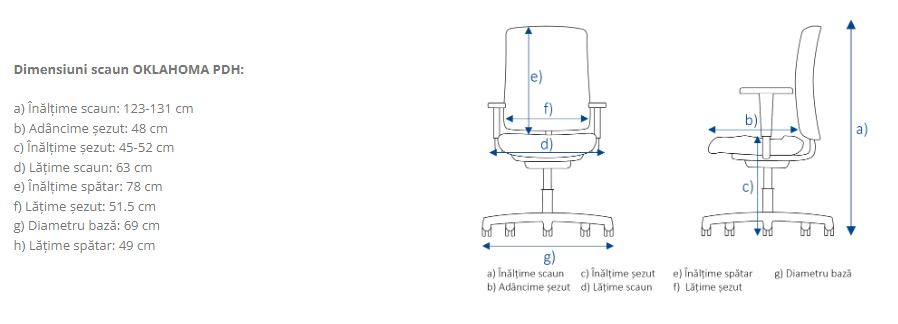 Oklahoma dispune de un spătar înalt foarte comod cu suport lombar care sprijină curba naturală a coloanei vertebrale. Suportul lombar este reglabil atât în adâncime cât și vertical. Șezutul scaunului realizat din poliuretan de densitate mare oferă suport confortabil utilizatorului chiar și în condițiile unei munci îndelungate. Brațele reglabile, baza piramidală din aluminiu șlefuit și rolele gumate sunt opțiuni standard pentru fiecare scaun Oklahoma.