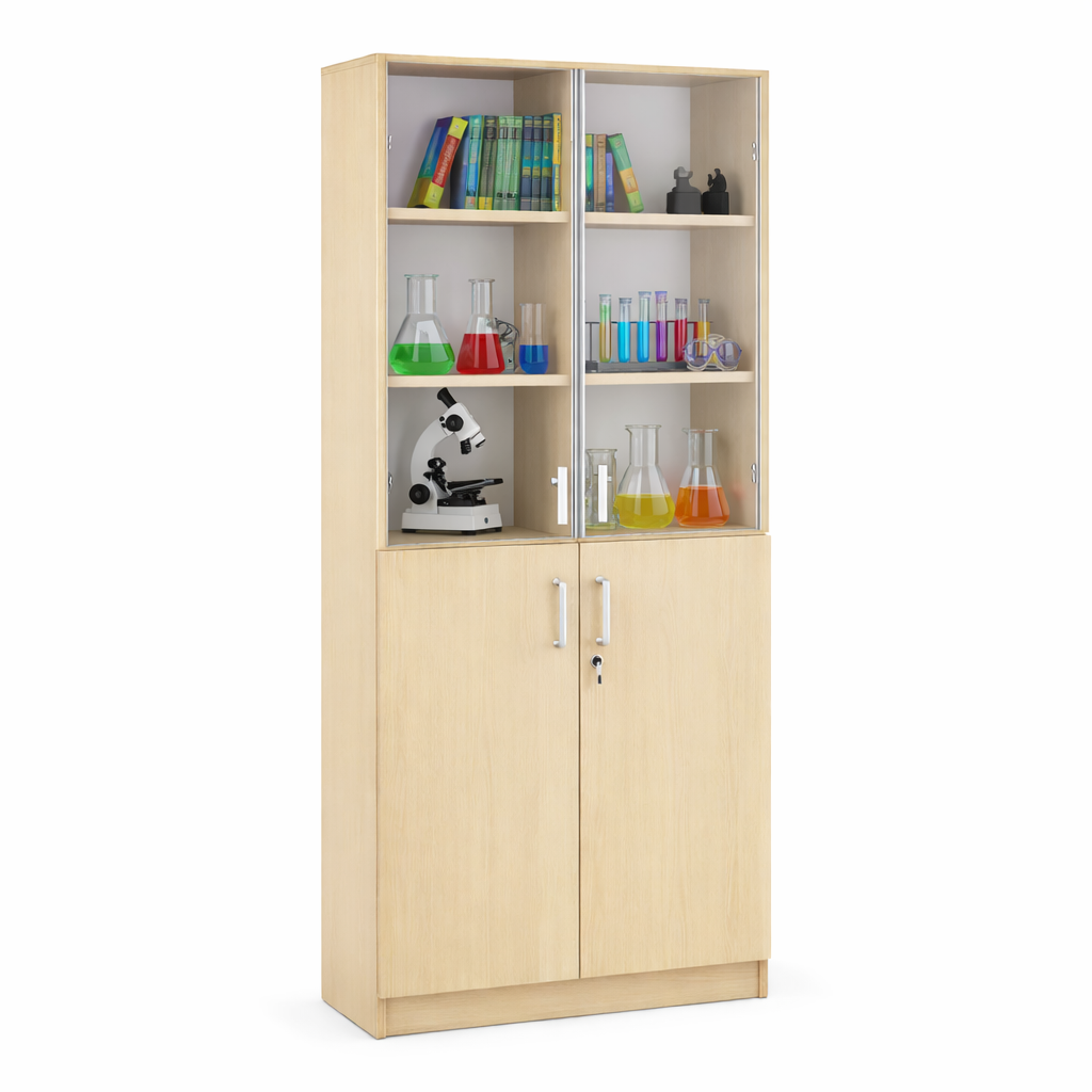Dulap vitrină cu uși din sticlă și dulap inferior cu uși pline, realizat din PAL melaminat rezistent, prevăzut cu polițe interioare pentru depozitare și expunere. Ideal pentru laboratoare și săli de clasă.