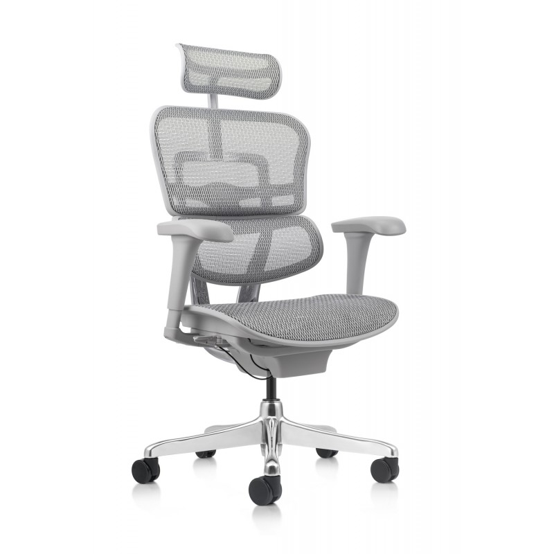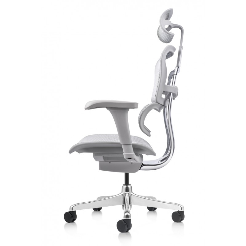 Dotări standard: tetieră 2D, spătar mesh reglabil pe înălțime, suport lombar, șezut mesh generos, mecanism sincron, translație șezut, brațe 3D, bază piramidală din aluminiu, și role gumate.